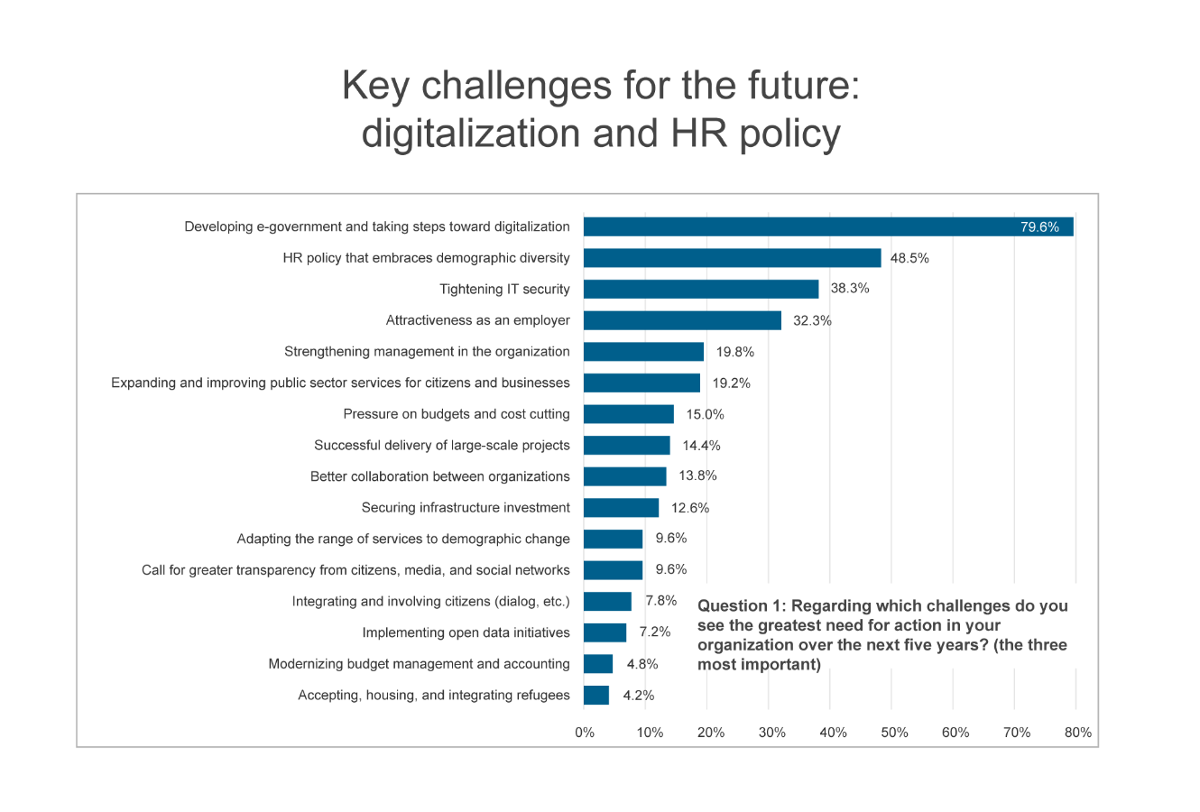 These include developing e-government and taking steps towards digitalization (79.6 percent), establishing an HR policy that embraces demographic diversity (48.5 percent), tightening IT security (38.3 percent), and remaining an attractive employer (32.3 percent).