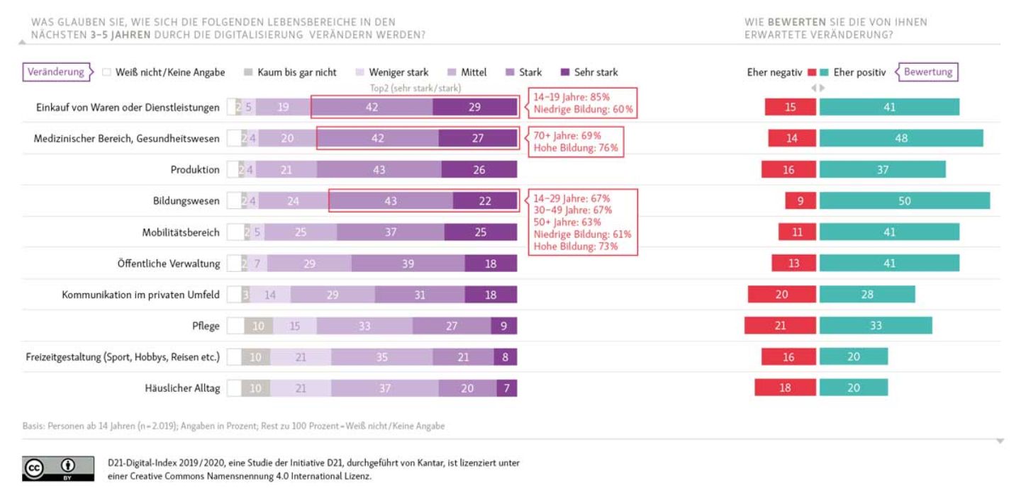 Empowering and motivating employees is therefore crucial to successful digitalization. According to the D21 study, the prospects for this are good, as the vast majority of those in employment believe the need for lifelong learning will increase as a result of digitalization. Of these 91 percent, 68 percent consider this to be a positive trend, while two-thirds even feel it is their responsibility to acquire digital skills. The study suggests that one of the reasons behind this is that the majority are more likely to be exposed to the digital world away from, rather than at, work and mainly teach themselves digital skills.