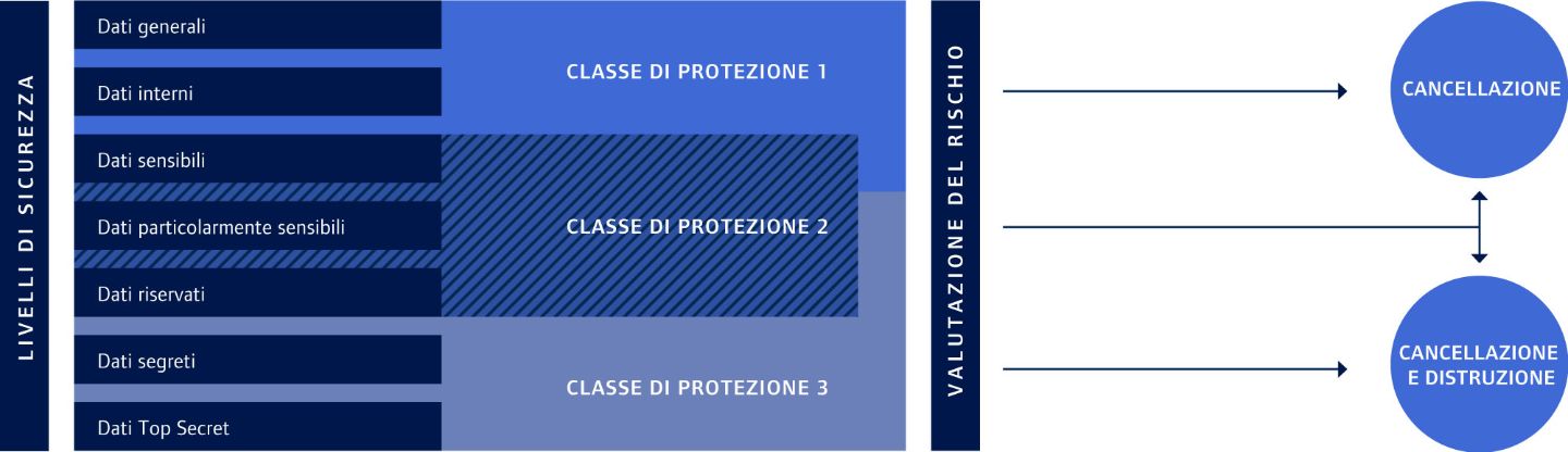 La scelta del processo di cancellazione è determinata dal grado di protezione richiesto. Parliamo di dati generali? I vostri supporti di memorizzazione contengono dati altamente sensibili e segreti? I vostri dati top secret richiedono un livello di protezione particolarmente elevato? In breve: cancellare o distruggere?