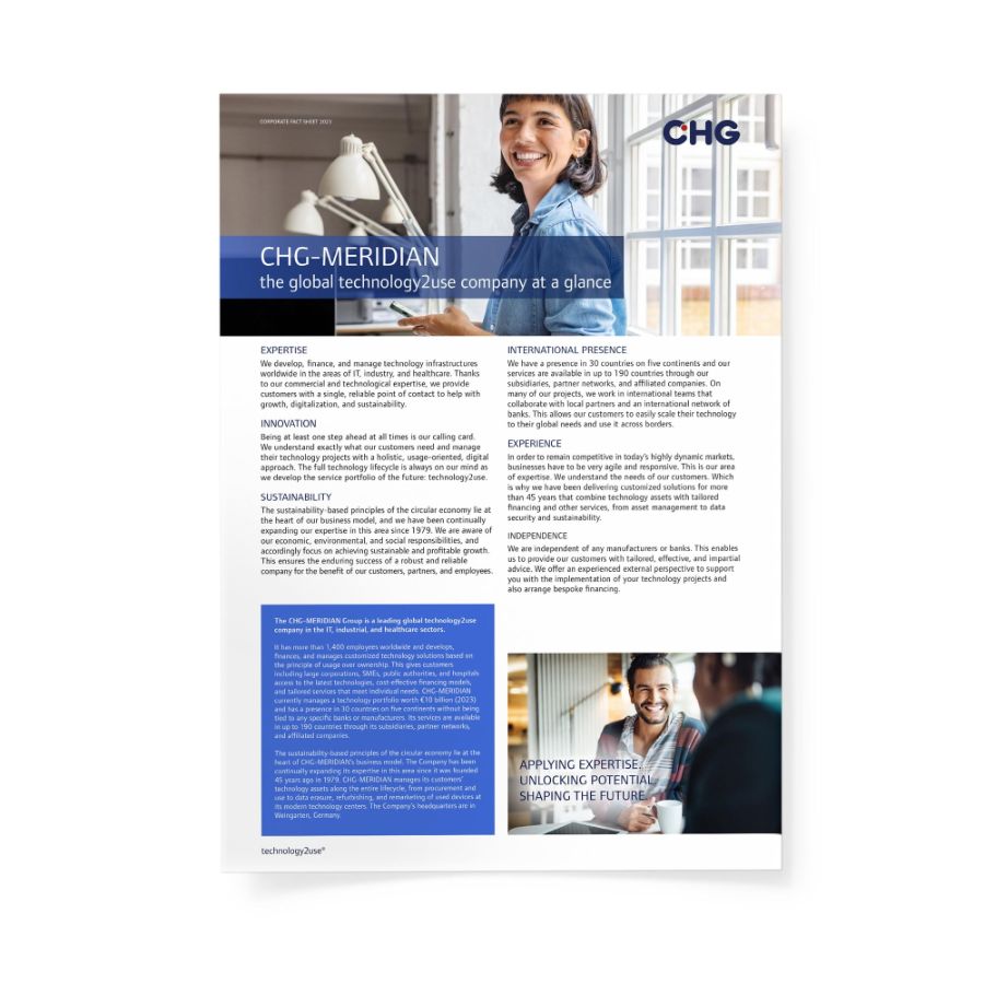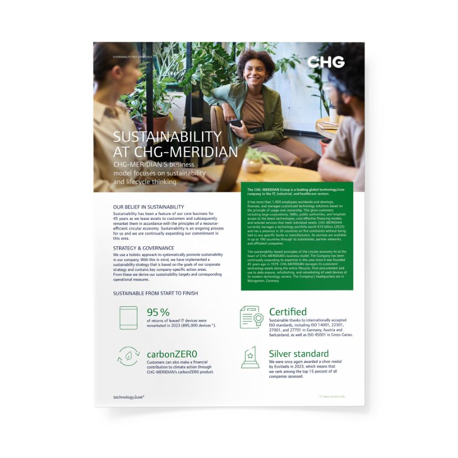 Hållbarhet har varit kärnan i vår verksamhet i mer än 45 år. Vi erbjuder utrustningsleasing med efterföljande renovering och remarketing i enlighet med principerna för den cirkulära ekonomin. Hållbarhet är en pågående process för oss och vi utökar kontinuerligt vårt engagemang på detta område. I detta sammanhang förstår vi hållbarhet som skärningspunkten mellan de tre dimensionerna ekonomi, ekologi och samhälle. En helhetssyn på alla tre hållbarhetsdimensioner är avgörande för att CHG-MERIDIAN ska fungera framgångsrikt på lång sikt.